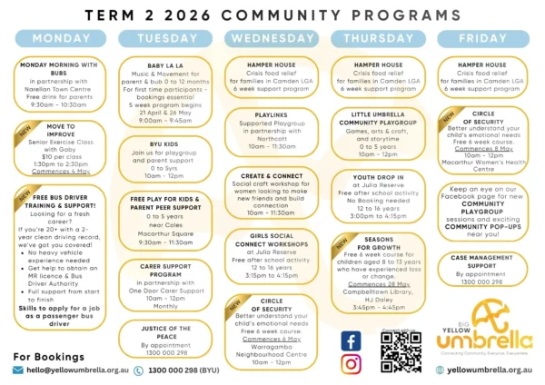 Explore the latest news, updates, stories, and event information from Big Yellow Umbrella. Our noticeboard keeps you informed and connected with what’s happening across Camden, Campbelltown, and Wollondilly.